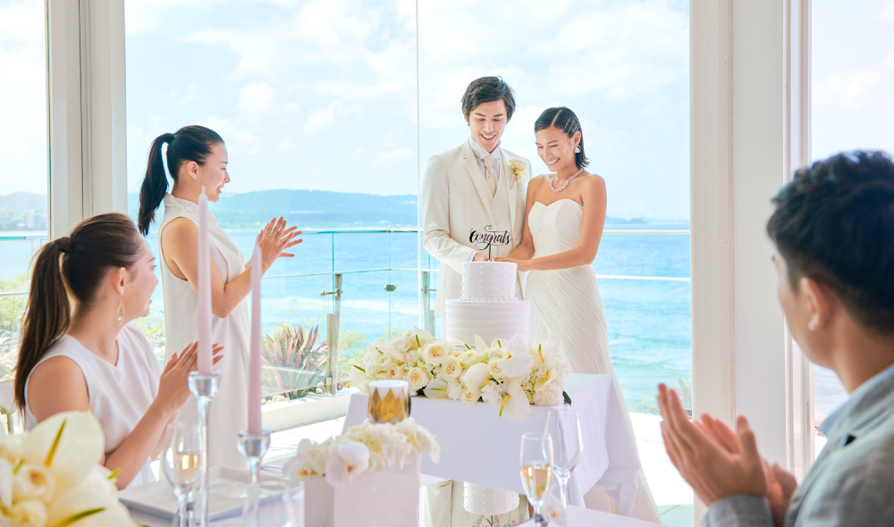 青い海とラグーンに囲まれた270度のウオータービュー、挙式のクライマックスに天から舞い降りる白い羽根が印象に残る挙式に。ゲストラウンジ「モエ・エ・シャンドン」で、パーティ前のひとときを楽しめる。